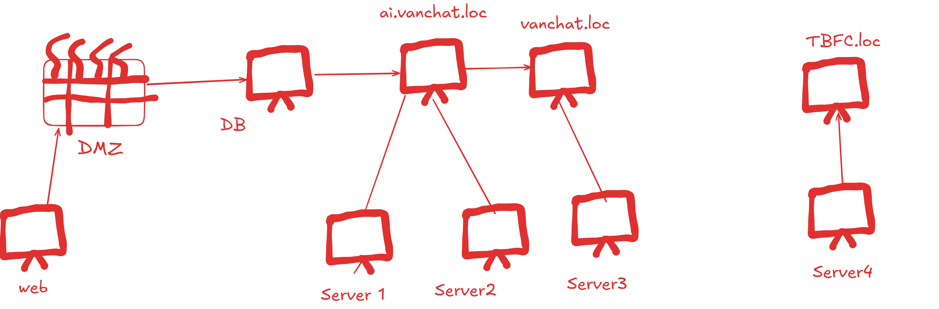 WEB -> DMZ -> DB -> AI.VANCHAT.LOC -> SERVER1 -> SERVER2 VANCHAT.LOC -> SERVER3 -> SERVER4 -> TBFC.LOC